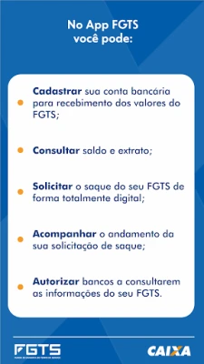 Utover de sentrale uttaksfunksjonene, tilbyr appen en rekke praktiske verktøy designet for å gjøre din FGTS-hverdag enklere. Du kan registrere og administrere dine bankkontoer for direkte innskudd av FGTS-midler, autorisere finansinstitusjoner til å konsultere din FGTS-informasjon for lån og finansiering, og enkelt oppdatere din adresse og personlige opplysninger. For nye brukere er registreringen gjort rask og sikker: bare velg "Cadastre-se" på innloggingsskjermen, bruk ditt CPF og din primære e-post, og du er i gang med å administrere dine rettigheter med full kontroll og ro i sinnet.