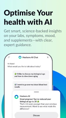 Det som virkelig skiller Healsens fra tradisjonelle velværeløsninger, er dens avanserte AI-kapasitet – nå også med banebrytende analyse av laboratorietester. Last opp et bilde eller en PDF av blodprøvesvarene dine, og Healsens skanner, gjenkjenner og organiserer resultatene på sekunder. Den kunstige intelligensen omdanner deretter komplekse blodprøvedata til lettforståelige helsetrender, slik at du kan spore endringer i vitaminer, hormoner, kolesterol, glukose og mye mer. I tillegg tilbyr Healsens en personlig AI-helseassistent som tolker dine data og gir skreddersydde råd for bedre søvnkvalitet, stressmestring og langsiktig helse. Du får også tilgang til vitenskapsbaserte helsevurderinger som tar din unike helsehistorie i betraktning, og lar deg dele fremdrift med legen din når som helst.