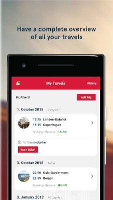 Appen gir deg også enestående fleksibilitet og et helhetlig blikk på alle dine reiser. Endre Flex-billetter med et par enkle klikk, og legg til og spor reiser som ikke ble bestilt via din egen profil, slik at du har alt på ett sted. Dine tidligere eventyr er trygt lagret i et oversiktlig reisearkiv, og med automatisk pålogging får du raskere tilgang til din informasjon og bestilling. Med offline-støtte er viktig reiseinformasjon alltid tilgjengelig, selv uten internett. I tillegg kan du enkelt legge til boardingkort i Passbook etter online innsjekking, noe som sikrer en smidig overgang fra skjerm til gate.